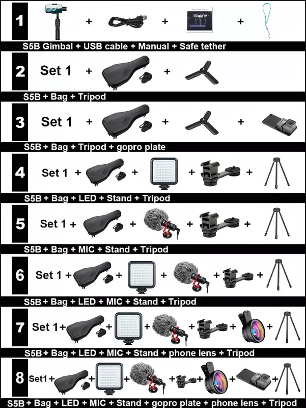 Stabilizator Eken S5B w AliExpress kosztuje 56$, ale można też dokupić zestaw z dodatkowym mikrofonem, podświetleniem LED, obiektywem i wszelkiego rodzaju mocowaniami. Takie zestawy kosztują od 65 do 115 dolarów.