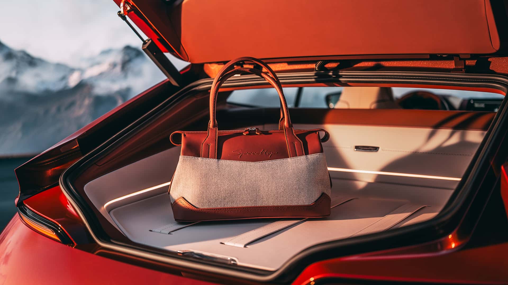Ta sama skóra i elementy podświetlenia przenikają do bagażnika. Przy okazji, Speedtop będzie dostarczany z zamówionymi torbami Schedoni.