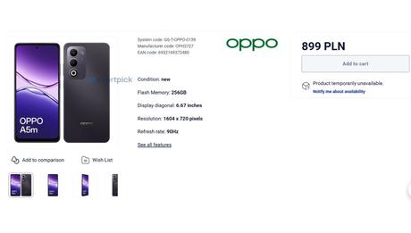 Oppo przygotowuje nowy smartfon A5m — jego parametry i cena przypadkowo ujawnili jeszcze przed oficjalną zapowiedzią. W Polsce urządzenie już się pojawiło w sprzedaży według wstępnych informacji, i wiadomo, że będzie kosztować około 899 złotych, co odpowiada około $239 lub €211.