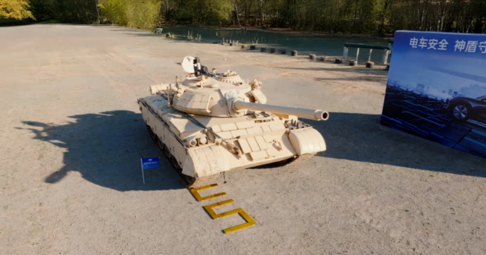 Bateria elektrycznego pojazdu Galaxy E5 chińskiego producenta samochodów Geely pomyślnie przeszła niezwykłe testy ściskania z użyciem 36-tonowego czołgu ZTZ-59D (Typ 59).