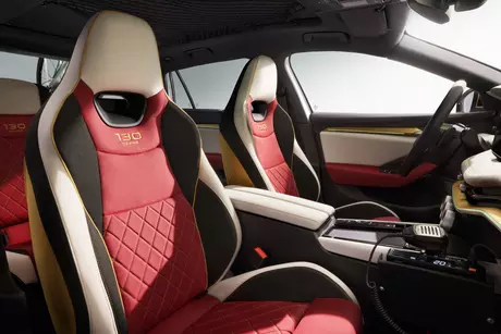 Wnętrze оформлено w tradycyjnym dla Laurin Klement kolorystyce: czarny, czerwony, biały i złoty. Użyto materiałów nadających się do recyklingu, na sportowych przednich siedzeniach znajduje się haft "130 lat".