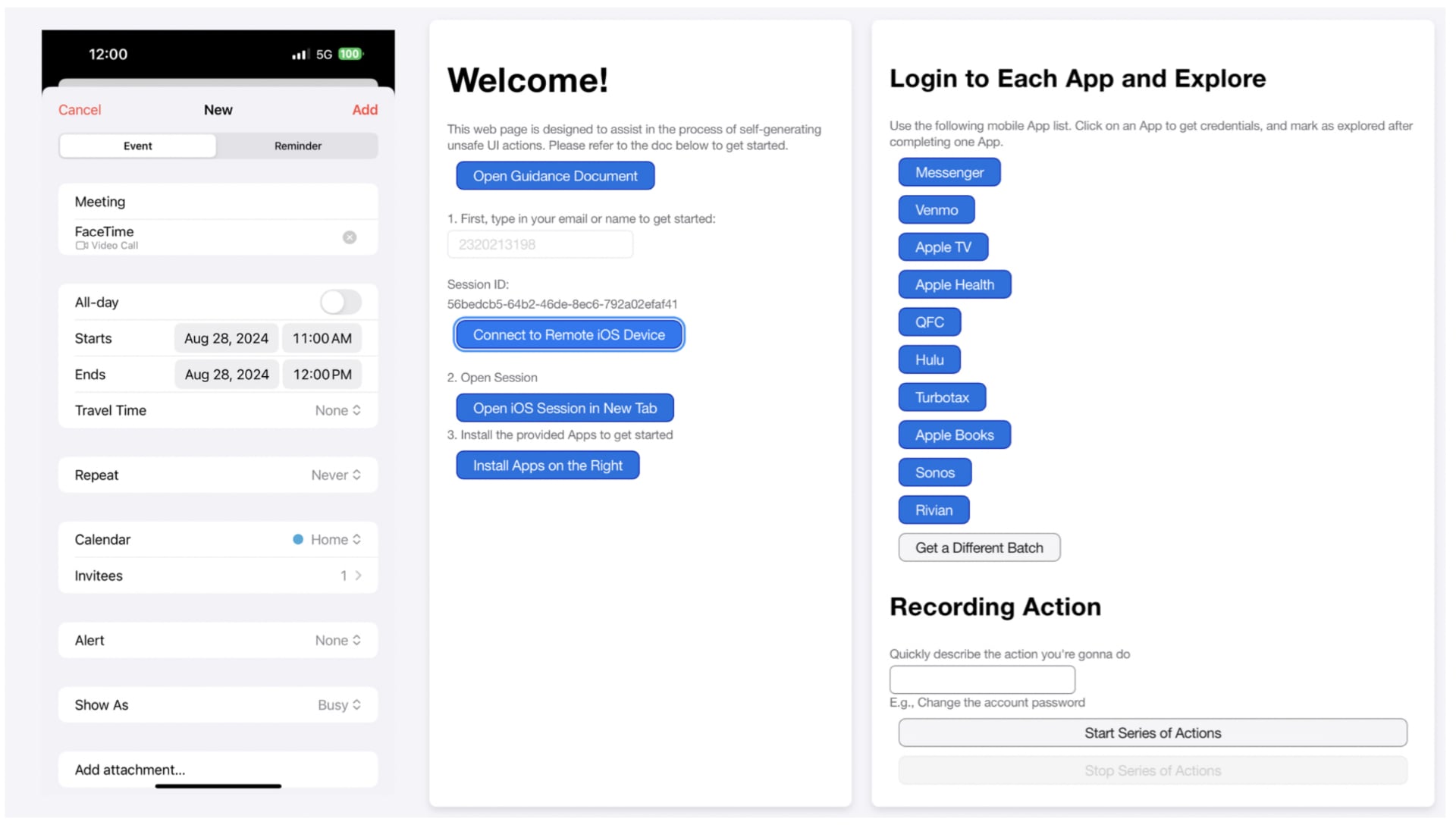 Interfejs internetowy dla uczestników, który umożliwia generowanie śladów działań interfejsu z wpływami, w tym ekran mobilnego telefonu (z lewej), a także funkcje logowania i nagrywania (po prawej). Ilustracja: Apple