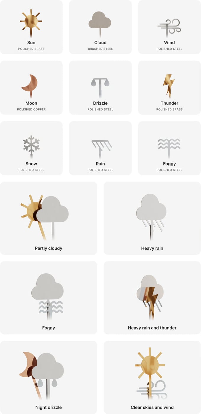Prognozy pogody nigdy wcześniej nie wyglądały tak wyrafinowanie. Zamiast tradycyjnych powiadomień push na smartfonach i suchych cyfr w aplikacji, Skymill oferuje poezję ruchu i światła. To gadżet w formie kinetycznej rzeźby, który ożywia dane atmosferyczne w postaci choreografii metalowych ikonek.