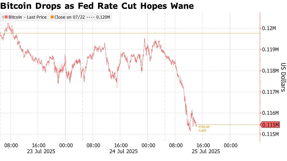25 lipca Bitcoin ponownie udowodnił, że rynek kryptowalut wciąż jest wrażliwy na tradycyjną ekonomię. Największa kryptowaluta na świecie spadła do 114 762 USD, minimalnego poziomu od 11 lipca, po tym jak na rynkach zaczęły wygasać nadzieje na szybkie obniżenie stopy kluczowej przez Federalny Rezerwat USA (Fed). Później kurs trochę się odbił, ale niepokojący dzwonek już zabrzmiał.