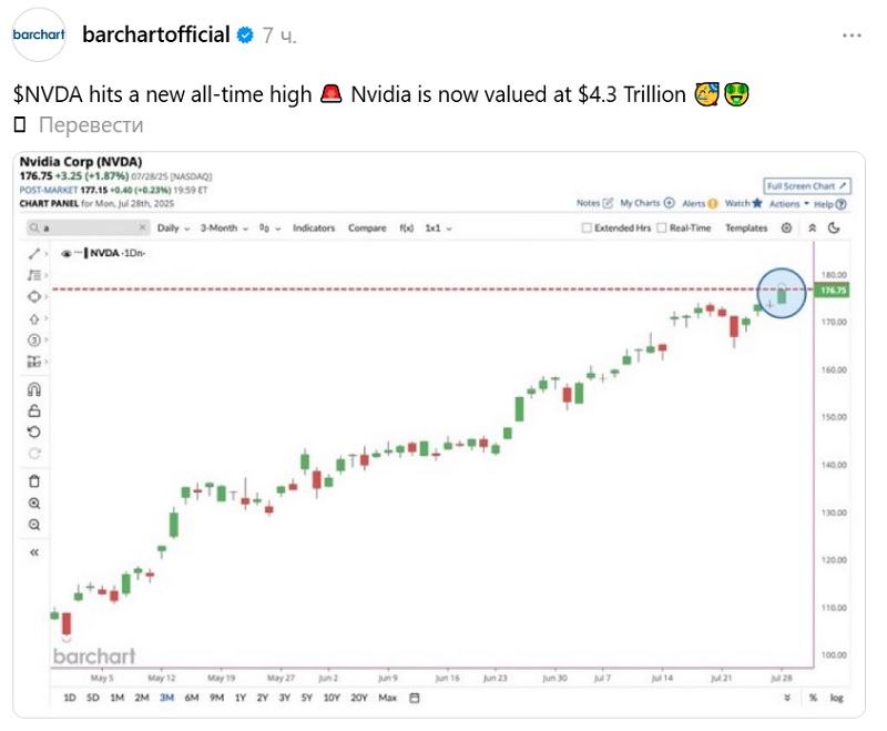 Na koniec handlu w poniedziałek 28 lipca wartość rynkowa Nvidia przekroczyła 4,3 bln dolarów, co stało się historycznym maksimum. Taki wynik udało się osiągnąć dzięki wzrostowi amerykańskich indeksów giełdowych SP 500 i Nasdaq, a także decyzji administracji Trumpa o wznowieniu eksportu chipów Nvidia do Chin.