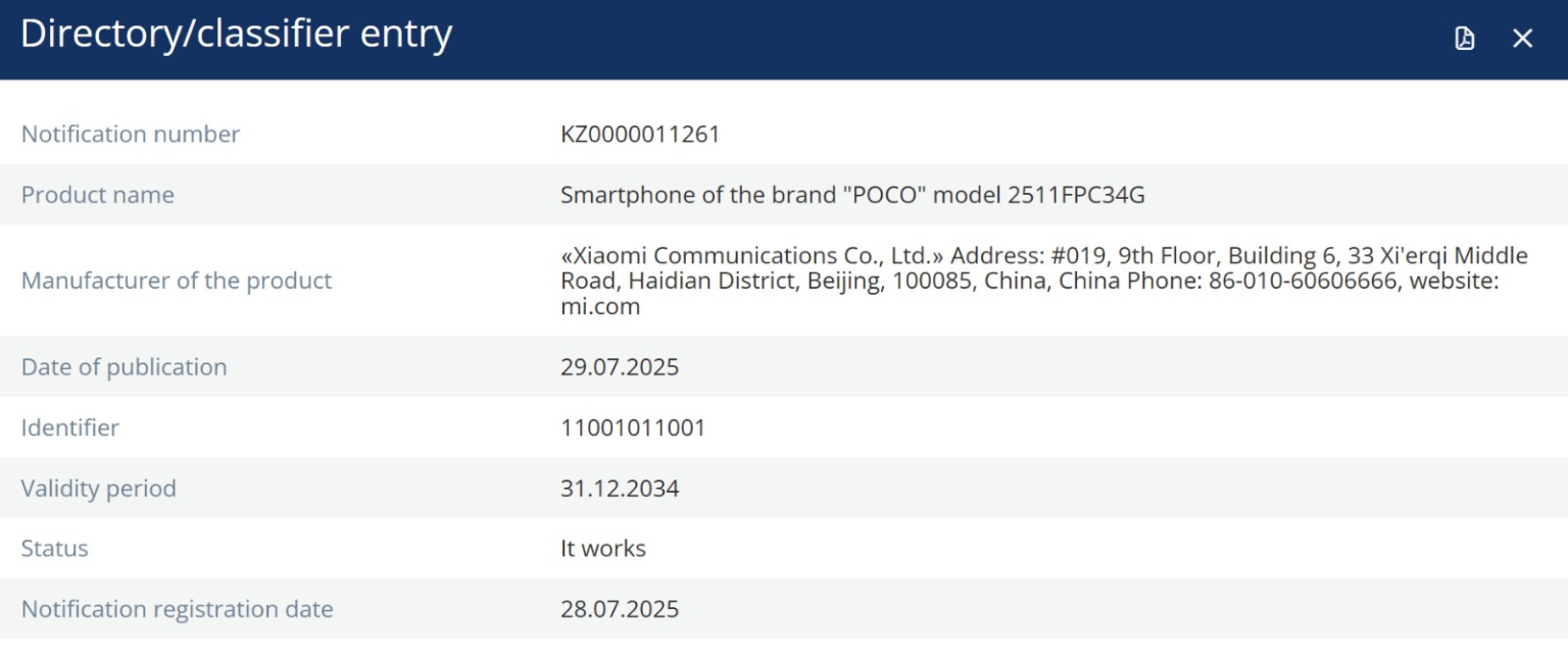 29 lipca 2025 roku w bazie danych Europejskiej Komisji Certyfikacji Ekonomicznej (EEC) pojawił się nowy smartfon marki Poco, który prawdopodobnie jest przyszłym Poco X8 Pro. Urządzenie ma numer modelu 2511FPC34G, co wskazuje na globalną wersję. Wcześniej, w bazie IMEI, wykryto podobne numery: 2511FPC34G – globalna wersja, 2511FPC34I – wersja indyjska, która, według źródeł, również jest związana z tym modelem.