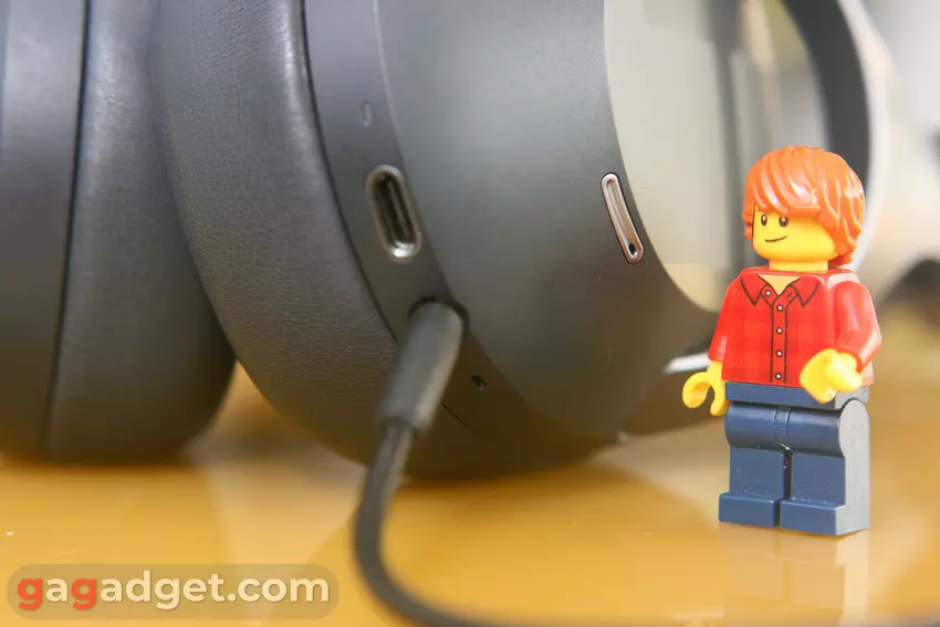 Tym samym materiałem pokryte są poduszki nauszne, z literami R i L po wewnętrznej stronie poduszek, aby oznaczyć lewą i prawą stronę. Na zewnętrznej stronie można zobaczyć wizerunek litery "H", podobnie jak w innych modelach z tej serii. Wszystkie złącza i elementy sterujące znajdują się na prawej muszli. Są to oddzielne przyciski zasilania i redukcji szumów, podwójny przełącznik głośności, otwór mikrofonu, wskaźnik LED, port USB-C i gniazdo zewnętrznego mikrofonu.