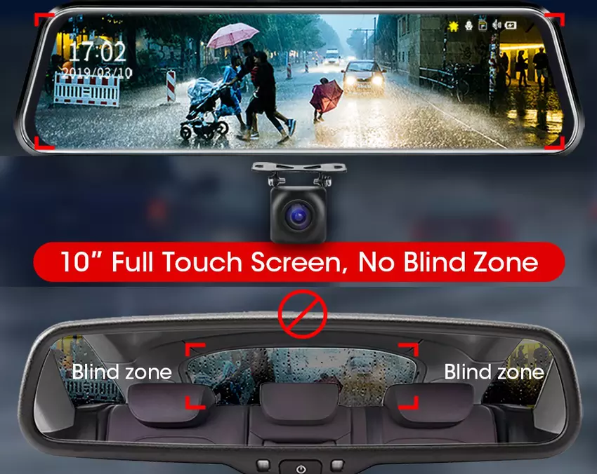 Nie martw się, że nie znasz tego producenta. Aliexpress nauczył się rozwiązywać ten problem za pomocą oceny. A sklep fabryczny Jansite ma ocenę 97,5%, co pozwala rynkowi umieścić go na liście najlepszych marek i nadać odpowiedni znaczek. To najbardziej zaawansowany model rejestratora montowanego w lustrze i w tym modelu dotykowy (!) wyświetlacz zajmuje całą powierzchnię lustra. Umożliwia również wyświetlanie danych z kamery przedniej i tylnej oraz oferuje opcję połączonego wyświetlania, gdy ekran jest podzielony na dwie części, gdzie transmitowany jest obraz wideo z obu kamer. Kamerę cofania można "usunąć" przy zakupie, ale nie polecamy - rejestrator pracuje tylko z tą „natywną” kamerą, nie można dostarczyć „innej”, są niekompatybilne. Dzięki algorytmom przetwarzania obrazu nagrywanie jest mniej zależne od pogody i zapewnia lepszą widoczność. Ekran dotykowy aparatu umożliwia sterowanie obszarem obrazu poprzez przewijanie palcem. Szerokokątny obiektyw kamery pozwala na sterowanie 3 pasami ruchu, nie ma martwych punktów nawet z tylną kamerą - jej kąt obszaru wynosi 140 stopni (dla przedniej kamery 170). Można trochę zaoszczędzić (3 USD), jeśli wybierzesz tylną kamerę 480p zamiast 1080p, ale czy to ma sens?