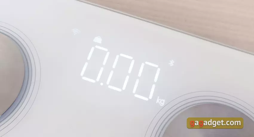 Na wyświetlaczu ikona pokazuje aktualny rodzaj pomiaru (waga, tętno, zawartość tkanki tłuszczowej), wyniki pomiarów oraz wskaźniki połączenia Bluetooth i Wi-Fi.