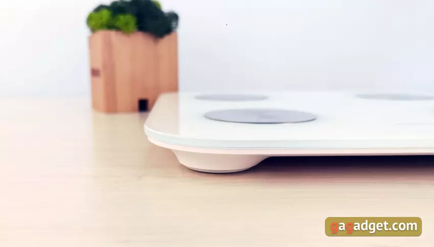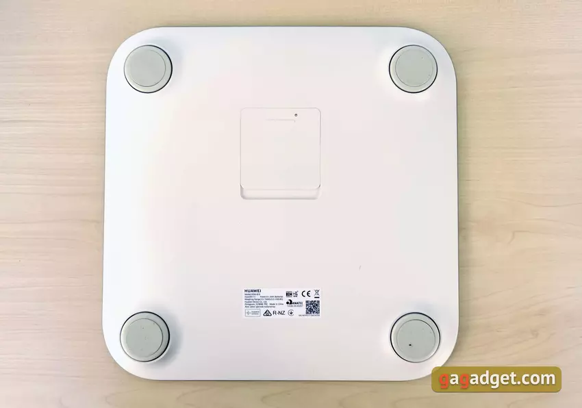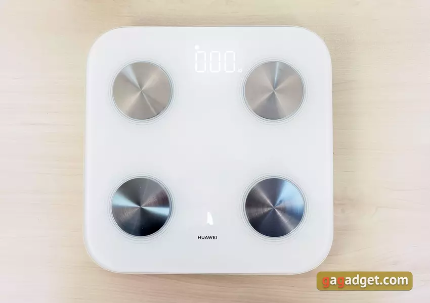 Sądząc po asortymencie w sklepach internetowych, istnieje wiele odmian wyglądu „inteligentnych” wag, zaczynając od designu śmieszne różowe kwiaty po całkowicie neutralne i zgrabne modele. HUAWEI Scale 3 odnoszą się do tych drugich. Kolor biały, góra - szkło, wyświetlacz LED i cztery elektrody do oceny składu ciała na podstawie oporu elektrycznego w tkankach (bioimpedancja).