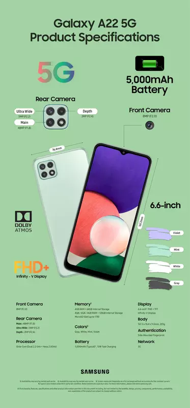 Jak dla zwykłego Galaxy A22, to nie obsługuje sieci piątej generacji w pierwszej kolejności. Ponadto, smartfon został wyposażony w 6,4-calowy ekran o rozdzielczości HD+ z matrycą AMOLED o częstotliwości odświeżania 90 Hz. W urządzeniu znajdziemy również prostszy układ MediaTek Helio G80, brak slotu microSD, 13-megapikselowy aparat przedni oraz główny z czterema modułami. Główny sensor ma rozdzielczość 48 MP i wsparcie OIS. Uzupełnia go szerokokątny obiektyw 8 MP, czujnik głębi 2 MP oraz obiektyw makro o tej samej rozdzielczości. Oba smartfony wyposażone są w baterie o pojemności 5000 mAh, zasilacze 15W oraz boczne skanery linii papilarnych. Nie wiadomo, czy nowości posiadają NFC.