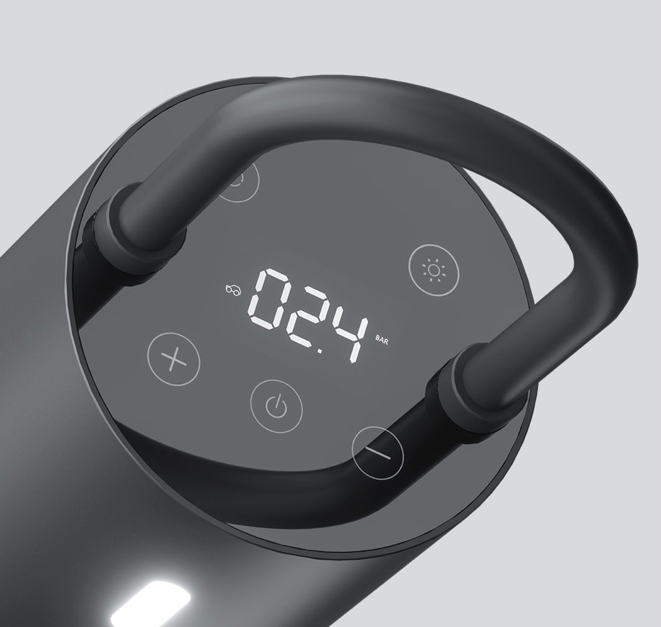 .Urządzenie ma całkowicie metalową obudowę w kształcie walca i waży 480 gramów. Zawiera podświetlany ekran wyświetlacza, który pokazuje aktualne ciśnienie oraz tryb pracy. Sterowanie odbywa się za pomocą przycisków dotykowych.