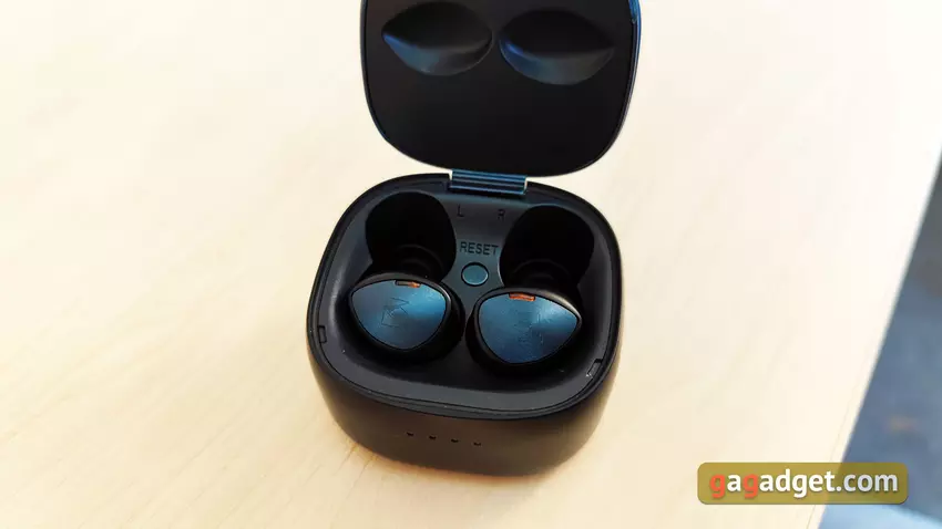 Po zamknięciu korpus ma samoczynne wykończenie i dobrze się trzyma w tym stanie. Wewnątrz etui wszystko jest prawie znajome: miejsca na słuchawki ze stykami do ładowania i magnesami do „dopasowania” do żądanej pozycji. Jak pokazała praktyka, konstrukcja nie jest najwygodniejsza: nie jest tak łatwo wyjąć słuchawki z etui. Przycisk resetowania znajduje się między słuchawkami, aby przywrócić ustawienia fabryczne.