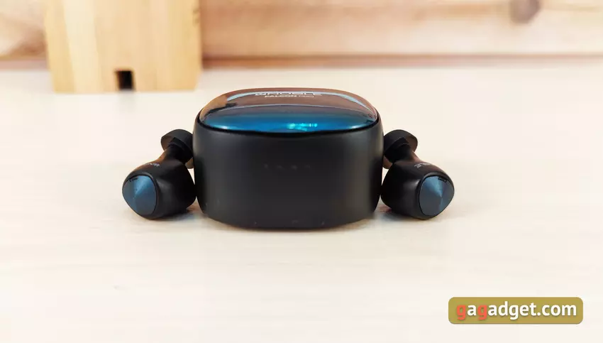 Etui ładujące nie jest najmniejsze. Ale można to wybaczyć, biorąc pod uwagę obsługę bezprzewodowego ładowania Qi. Wygląda interesująco i jest wykonany w tym samym stylu, co i słuchawki. Główna część to matowy czarny plastik, a wieczko jest błyszczące, niebieskie z nazwą modelu. Z przodu znajdują się cztery wskaźniki LED poziomu naładowania obudowy.