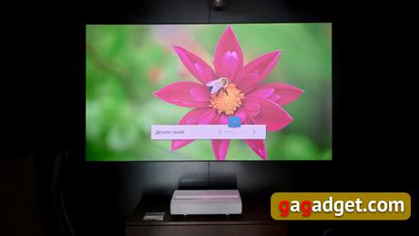 Oczywiście ocenianie obrazu projektora ze zdjęć jest jeszcze trudniejsze i bezsensowne niż ocenianie obrazu telewizora ze zdjęć, dlatego postaram się opisać obraz słowami. Widać, że wieczorem obraz jest jasny i nasycony. A najważniejszym niuansem podczas oglądania jest pełne wrażenia kinowe, gdy siedzisz w wygodnym fotelu zaledwie kilka metrów od ekranu. Rozmiar obrazu po prostu Cię pochłania i tworzy całkowitą iluzję przebywania w sali kinowej. W świetle dziennym obraz oczywiście nie jest już tak jasny, powiedziałbym, że przegrywa pod względem jasności i nasycenia kolorów do najlepszych technologii telewizyjnych – OLED i QLED. Ale muszę przyznać, że to bynajmniej nie frustruje i nie umniejsza przyjemności oglądania. Chociaż jestem pewien, że dla części potencjalnych nabywców będzie to powód do odmowy zakupu. Ale uwierz mi na słowo, cały czas byłem przyłapany na patrzeniu na siebie, że siedzę z opadającą szczęką, a to jest kompletna alegoria – oglądanie filmu na wielkim ekranie daje takie nowe doznanie. Prawdopodobnie z czasem można się do tego przyzwyczaić (człowiek przyzwyczaja się do wszystkiego), po miesiącach (a może tygodniach) nowość doznań straci ostrość. Ale coś mi mówi, że osoba, która raz przerzuciła się na projektor w kinie domowym, nigdy nie wróci do telewizora. A zakup projektora wcale nie neguje obecności telewizorów w innych pomieszczeniach domu. Tyle, że głównym ekranem w domu jest ekran projekcyjny.