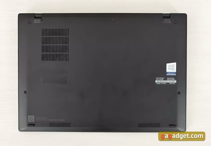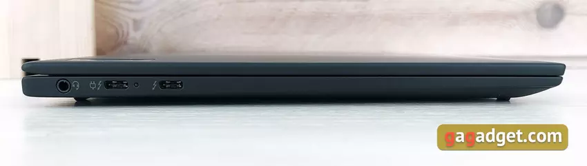 Ale w przeciwieństwie do „większych” przedstawicieli linii, Lenovo ThinkPad X1 Nano otrzymał bardzo skromny zestaw portów. Po prawej stronie laptopa nie ma ich wcale. A z użytecznego jest tylko przycisk zasilania ze wskaźnikiem LED i otworami wentylacyjnymi: