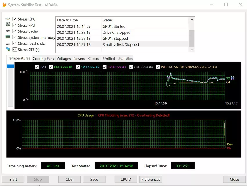 Test warunków skrajnych AIDA64 wykazał, że przy maksymalnym obciążeniu od samego początku procesor potrafi się nagrzewać do 100° (formalnie throttling wynosił aż 2%, czego w ogóle nie można brać pod uwagę), po czym układ chłodzenia przyspiesza a wnętrze nie nagrzewa się powyżej 80 °. Oczywiście nie ma spadków wydajności. Sam CO pracuje bardzo cicho nawet w trybie maksymalnej wydajności. A przy minimalnych obciążeniach całkowicie się wyłącza.