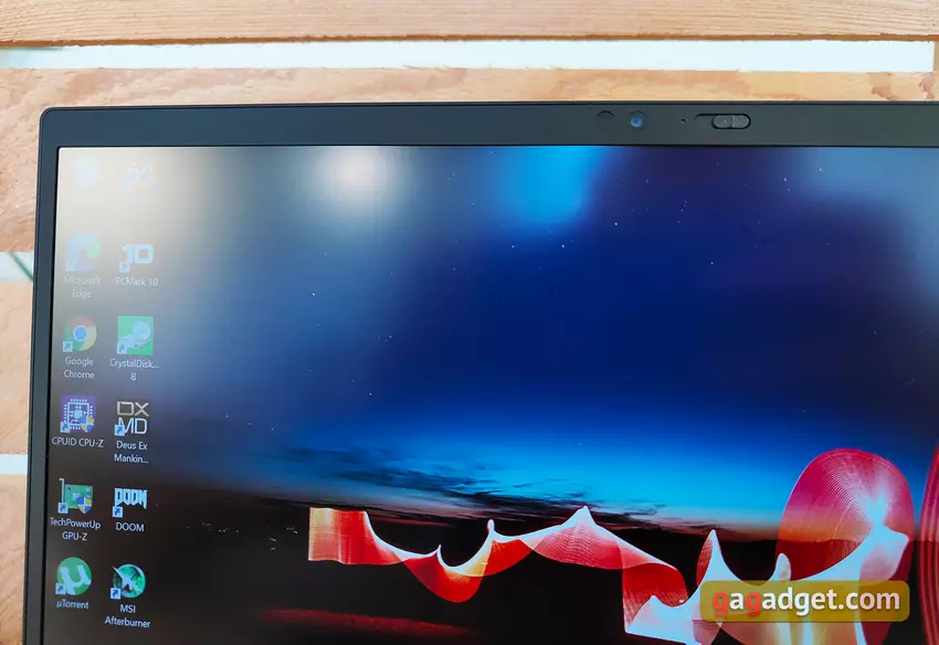 Nad ekranem jest umiejscowiona kamera internetowa, kamera na podczerwień do rozpoznawania właściciela laptopa, wskaźnik LED działania oraz fizyczna osłona ThinkShutter, która w razie potrzeby zasłania obie kamery. Ramki na całym obwodzie ekranu są dość cienkie, jak przystało na nowoczesny ultrabook.