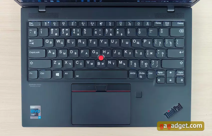 Laptop można łatwo otworzyć jedną ręką. Jednocześnie zawiasy wystarczająco pewnie mocują wyświetlacz i nie zaczyna on wibrować przy najmniejszym dotknięciu. Maksymalny kąt otwarcia laptopa to 180°. Układ klawiatury to standardowy ThinkPad, ale same przyciski są nieco inne. Z funkcji układu: zamieniono lewy klawisz Ctrl i Fn, co może nie być zbyt wygodne. Ale w ustawieniach możesz go zwrócić. Oddzielne przyciski Home, End i Delete znajdują się na końcu górnego rzędu, blok strzałki jest lekko wysunięty w kierunku użytkownika, a klawisze PgUp i PgDn znajdują się po bokach strzałki w górę. Jednocześnie PrtSc znajduje się pomiędzy prawym Alt i Ctrl. Przy przejściu z laptopa innego producenta przyzwyczajenie się do tego zajmie trochę czasu, ale nic krytycznego.