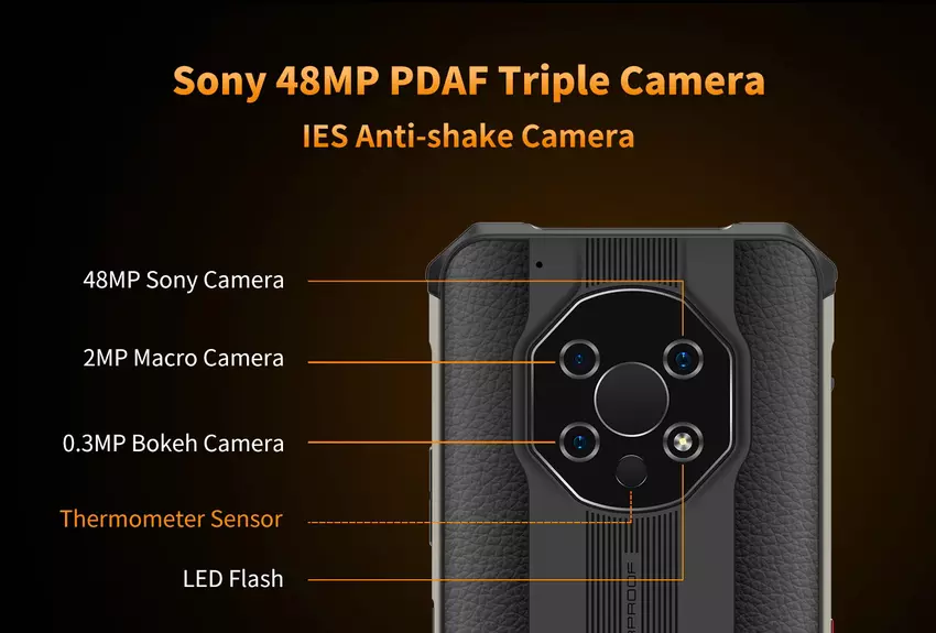Główny aparat w urządzeniu posiada trzy czujniki. Główny sensor to 48 MP Sony. Uzupełnia go moduł makro 2 MP oraz czujnik głębi 0,3 MP. Z nowości warto również wspomnieć o jednym, konfigurowalnym dla różnych akcji, przycisku oraz wbudowanym termometrze na podczerwień. Może być stosowany do pomiaru temperatury ciała, przedmiotów i pomieszczeń.