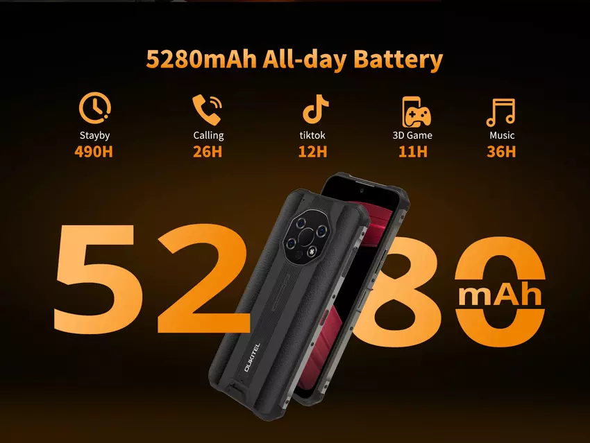 OUKITEL WP13 zasilany jest akumulatorem o pojemności 5280mAh. Ładuje się przez port USB-C za pomocą dołączonego zasilacza o mocy 18W. Urządzenie posiada również skaner linii papilarnych, funkcję Face Unlock, która działa za pośrednictwem przedniej kamery 8MP oraz moduł NFC do płatności zbliżeniowych Google Pay.