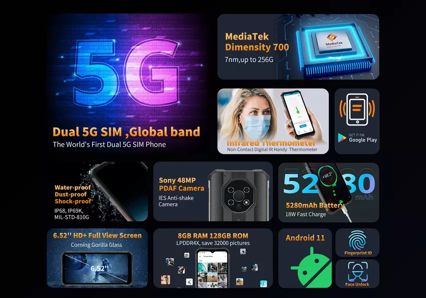 .Urządzenie posiada 6,52-calowy ekran IPS o rozdzielczości 1600×720p oraz wodoodporną obudowę MIL-STD-810G i IP68/IP69K. Pod maską nowego produktu znajduje się układ MediaTek Dimensity 700. SoC zbudowany jest w 7nm procesie technologicznym i zawiera zintegrowany modem 5G, a także dwa wydajne rdzenie ARM Cortex-A76 taktowane maksymalną prędkością 2.2GHz oraz sześć energooszczędnych rdzeni ARM Cortex-A55 taktowanych zegarem 2.0GHz. Układ jest sparowany z 8GB pamięci RAM i 128GB pamięci masowej. W razie potrzeby można go rozszerzyć za pomocą karty pamięci.