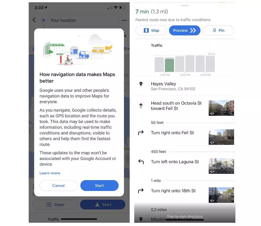 Żądania wysyłane obecnie przez Google oferują dwie opcje: "Anuluj" i "Rozpocznij". Jeśli wybierzesz opcję "Anuluj", nie będziesz już mógł otrzymywać nawigacji z głosowymi podpowiedziami w czasie rzeczywistym. Zamiast tego otrzymasz standardową listę krok po kroku, która zaprowadzi Cię do kolejnego celu.