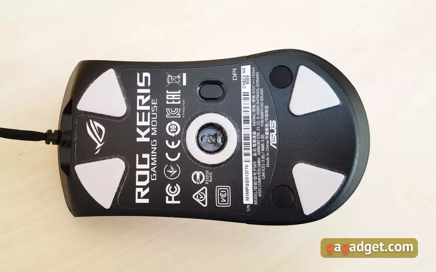 Na spodzie myszy znajdują się cztery trójkątne teflonowe nóżki ROG Omni Mouse w kolorze białym. Przy każdym znajduje się małe zagłębienie ułatwiające ich wydobycie i zastąpienie nowymi. Kolejna wkładka teflonowa znajduje się wokół okienka czujnika optycznego PixArt PMW3389. Obok znajduje się przycisk przełącznika DPI. A pod dwoma okrągłymi gumowymi zatyczkami znajdują się śruby, które należy odkręcić, aby zdjąć górną pokrywę podczas wymiany przełączników.
