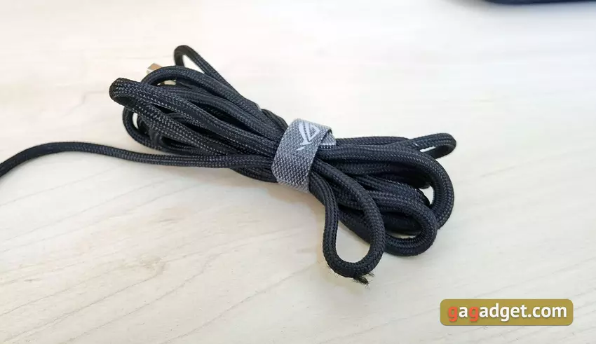 Mamy przewodową wersję ASUS ROG Keris. Ma niewymienny kabel ASUS Paracord, taki jak ASUS ROG Gladius III. Pod względem wygody kabel jest dobry: jest bardzo lekki, giętki i praktycznie niezauważalny podczas użytkowania. Ale wydaje się, że z żywotnością nie wszystko jest takie dobre. Keris trafiła do nas nie nowa, więc można ocenić ślady użytkowania. Oprócz tego, że plecionka robi się fałdami i jest skręcona względem kabla w środku, szybko nabiera mało estetycznej formy.
