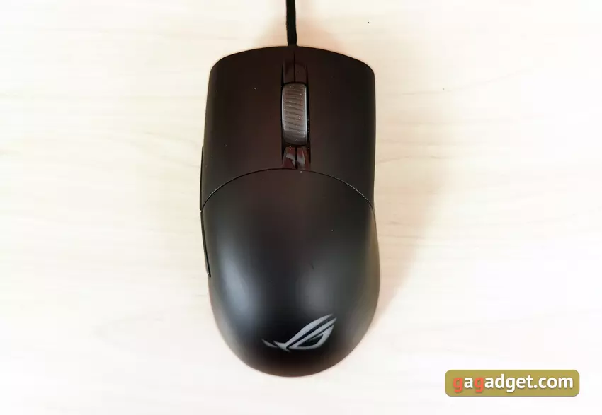 Kółko przewijania ma gumowaną powłokę z ukośnymi nacięciami. Jest w pełni oświetlone, jak w ROG Gladius III, która już była przez nas testowana. Chociaż w większości myszy do gier podświetlone są tylko boki. Wygląda to dobrze lub źle - każdy sam decyduje. Co więcej, podświetlenie można całkowicie wyłączyć.