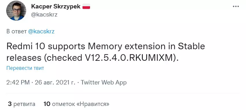 Tak więc, Redmi 10 kończy się z 5GB (4 + 1) pamięci RAM w konfiguracji podstawowej i 6GB (4 + 2) lub 8GB (6 + 2) w maksymalnej konfiguracji. Zwiększenie pamięci RAM o 3 GB jest dostępne tylko w smartfonach o pojemności 256 GB i 512 GB.