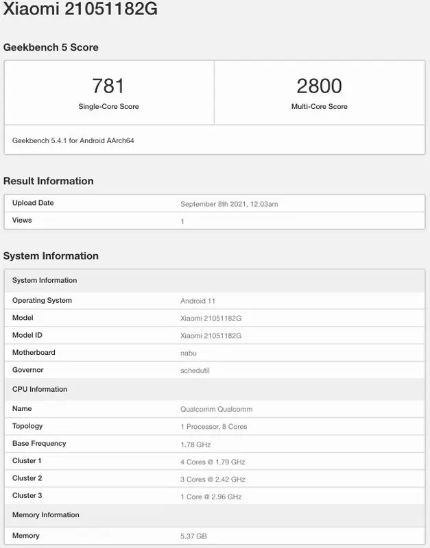 W teście wydajności urządzenie uzyskało 781 punktów i 2800 punktów odpowiednio w trybach Single-Core i Multi-Core. Benchmark potwierdza, że Xiaomi Mi Pad 5 działa na systemie operacyjnym Android 11 i posiada 6GB pamięci RAM.