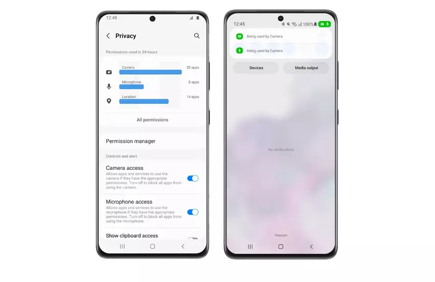 Firma wyraźnie wspomina o zwiększonej prywatności. System powiadomi użytkownika, gdy jedna z aplikacji uzyska dostęp do mikrofonu lub kamery. One UI 4.0 da użytkownikowi możliwość zobaczenia historii uprawnień na dany dzień i tydzień.