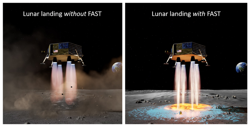 W FAST, ceramiczne cząstki tlenku glinu są wstrzykiwane do pióropusza rakiety podczas opadania. Cząsteczki te pokrywają powierzchnię, konsolidując regolit w solidną poduszkę o imponującej grubości, która jest wysoce odporna na ciepło i stabilna. Chroni to pojazd nie tylko podczas opadania, ale także podczas ponownego wejścia na orbitę księżycową.
