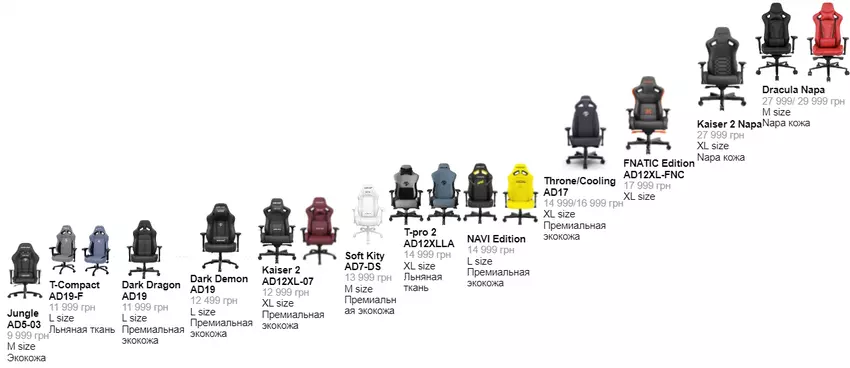 Aktualna linia Anda Seat jest bardzo imponująca. W ofercie znajdują się modele dla graczy, w tym współpracujące z organizacjami eSportowymi Fnatic i Na'Vi, jak również bardziej swobodne opcje, które będą harmonijnie wyglądać w biurze. Zakres cenowy jest dość szeroki: od niedrogich modeli za 10 000 UAH do modeli premium ze skórą Napa za 30 000 UAH. Niezależnie od ceny, we wszystkich modelach zastosowano piankowe obicia, wytrzymałe stalowe ramy i wysokiej jakości materiały tapicerskie.