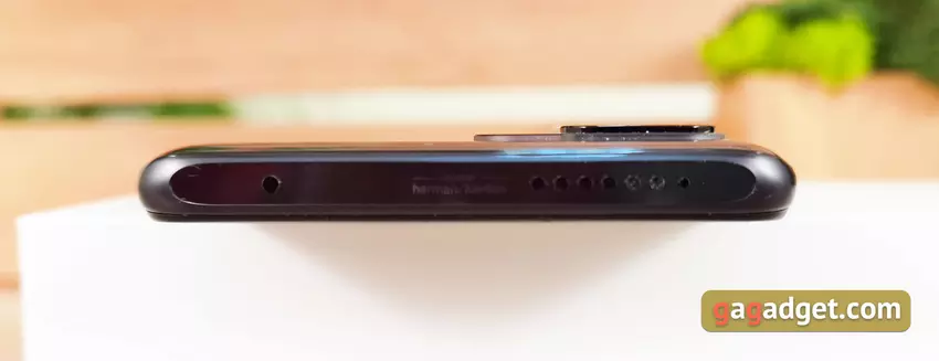 Na górnym i dolnym końcu znajdują się również szklane wstawki. Na górze znajduje się mikrofon, port podczerwieni do sterowania elektroniką, jeden z głośników stereo oraz logo harman/kardon. Twierdzi się, że firma zrobiła dźwięk w smartfonie.