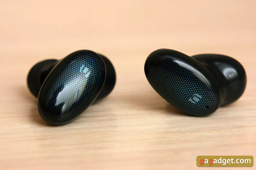 Same słuchawki są ciemnoniebieskie. Mają nietypowy kształt: coś pomiędzy długimi modelami z „nogami” a konstrukcjami, które nie wystają z uszu. HiTune X5 wystaje z uszu, ale nie krytycznie. Na zewnętrznej powierzchni (jest to sensoryczna) każdej słuchawki znajduje się gradientowy design z kropek oraz logo w postaci litery U, nad którym ukryta jest mała dioda LED.