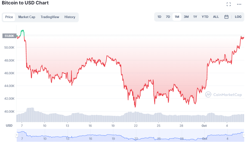 W momencie pisania tego tekstu, jedna moneta BTC jest wyceniana na 51 659 dolarów. W ciągu ostatniej doby jego wartość wzrosła o 4,62%, w ciągu tygodnia o 22%, a od początku roku o 76,5%. Wzrost z 1 października nastąpił po tym, jak Jerome Powell, przewodniczący amerykańskiej Rezerwy Federalnej, powiedział, że nie ma planów zakazania kryptowaluty w kraju.