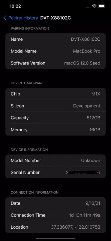 Pewien użytkownik zamieścił zrzut ekranu, na którym widać połączenie smartfonu z komputerem MacBook Pro 2021 o numerze modelu DVT-X88102C. Jest to prototyp, który został opracowany w celu przetestowania ostatecznej konstrukcji, o czym świadczy skrót DVT (Design Validation Testing).