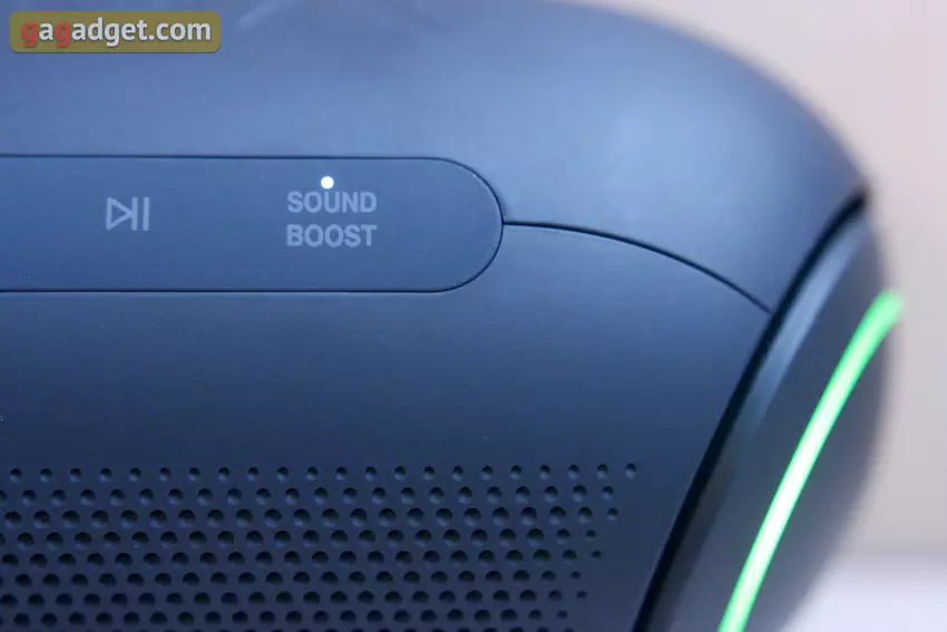 Na górnym panelu przycisków umieszczono porządny zestaw do sterowania kolumną. Z jego pomocą regulujemy głośność i wstrzymujemy muzykę bez dotykania smartfona. Krótko mówiąc, ten sam przycisk (odtwarzaj/pauza) można wykorzystać do wywołania asystenta głosowego, jeśli przytrzymasz go przez dwie sekundy. Włącz Sound Boost osobnym przyciskiem i pozostaw go w tym stanie (powiem Ci dlaczego trochę później). Dotyczy to wszystkich trzech urządzeń. Ale dwa starsze modele mają dodatkowe elementy sterujące z tyłu pod wodoodporną osłoną. Przycisk z wizerunkiem żarówki odpowiada za włączanie i wyłączanie podświetlenia LED, nieco później zobaczymy jak jest skonfigurowane w aplikacji mobilnej. Przycisk Dual aktywuje tryb dwukolumnowy (jest obecny we wszystkich trzech modelach). Jeśli masz dwie kolumny i chcesz z nich korzystać jednocześnie, kliknij w obie. Podobna zasada jest stosowana w trybie Multi (tylko w PL5 i PL7): jedno z urządzeń może być nadrzędne, a inne podrzędne za pomocą odpowiedniego przycisku.