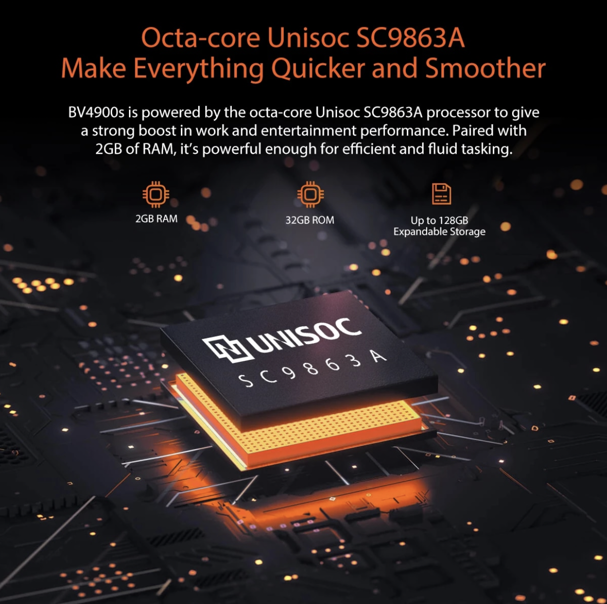 Powered by ośmiordzeniowy układ Unisoc SC9863A sparowany z 2GB RAM i 32GB ROM. Wbudowana pamięć masowa może być rozszerzona za pomocą karty microSD, jeśli jest to pożądane. Urządzenie posiada również 5.7-calowy ekran o rozdzielczości HD+, szkło hartowane Dragontrail, 8MP aparat główny oraz 5MP kamerę przednią. Urządzenie jest zasilane przez baterię o pojemności 5580 mAh. On, nawiasem mówiąc, wspiera funkcję powerbanku. Oznacza to, że za pomocą Blackview BV4900S można ładować inne gadżety.