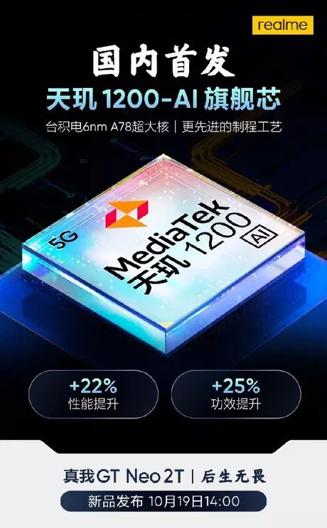 Jak już wcześniej spekulowaliśmy, urządzenie będzie się różniło od zwykłego Realme GT Neo 2 innym procesorem. Zamiast Snapdragona 870, Realme GT Neo 2T dostanie pod maską układ MediaTek Dimensity 1200. Po mocy jest porównywalny z procesorem firmy Qualcomm. SoC jest zbudowany w 6nm procesie technologicznym i posiada zintegrowany modem 5G, a także trzy rdzenie Cortex-A78 2.6GHz, jeden rdzeń Cortex-A78 3.0GHz i cztery rdzenie Cortex-A55 2.0GHz.