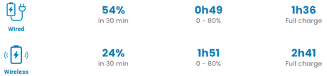 W tym miejscu smartfon napotkał problemy. Styczniowa nowość obsługuje ładowanie przewodowe o mocy 25 W. Bateria jest w pełni "naładowana" w ciągu 96 minut. Warto zaznaczyć, że pierwsze 54% pojemności uzyskujemy w ciągu 30 minut, natomiast do 80% baterii ładujemy w 79 minut. Jak Państwo zrozumieli, ostatnie 20% zajmuje 17 minut.