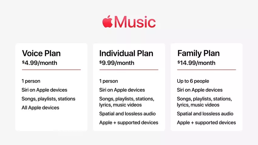Plan nosi nazwę Voice Plan i według firmy Apple umożliwia sterowanie muzyką wyłącznie za pomocą asystenta głosowego Siri. Ponadto, nie obsługuje dźwięku bezstratnego i przestrzennego z Dolby Audio. Oczywiście z takiego planu może korzystać tylko jedna osoba. Zasadniczo Voice Plan jest dla tych, którzy wolą słuchać muzyki za pomocą