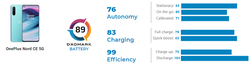 OnePlus Nord CE został liderem w swoim segmencie cenowym, natomiast pierwsze miejsce w ogólnym rankingu nadal zajmuje OPPO Reno 6. Smartfon wyposażony jest w baterię o pojemności 4300 mAh i obsługuje 65W ładowania, a test zakończył z 96 punktami na koncie.