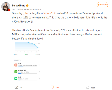 Menedżer napisał, że używał Redmi Note 11 przez 18 godzin i po tym czasie bateria zachowała 25% naładowania. Co ciekawe, Redmi CEO zauważył, że taki czas pracy na baterii oferuje wersja z baterią 4,500mAh. Możemy więc założyć, że pojawi się również modyfikacja z baterią o większej pojemności.