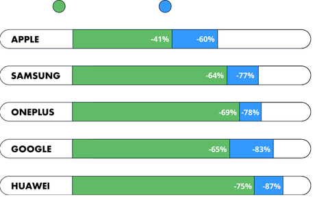tracimy?Zgodnie z oczekiwaniami, Apple i Samsung stały się firmami, których urządzenia amortyzują się najmniej w ciągu pierwszych 12 miesięcy. Średnio w ciągu urządzenia Apple tracą 41% swojej wartości w ciągu roku, a 60% w ciągu 24 miesięcy. Dla Samsung liczby te są nieco wyższe - 64% i 77%.