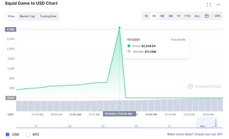 Cena kryptowaluty na serialu "The Squid Game" wzrasta do 2 856 dolarów i spada do zera w ciągu 10 minut