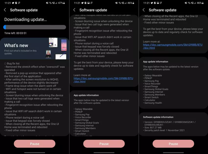 Rozmiar aktualizacji to nieco ponad 800 MB. Aktualizacja przynosi poprawkę bezpieczeństwa na listopad 2021 roku. Stabilny firmware One UI 4.0 Android 12 dla Samsunga Galaxy S21, Galaxy S21+ i Galaxy S21 Ultra spodziewany jest już wkrótce.