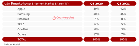 Agencja analityczna Counterpoint opublikowała wyniki badań amerykańskiego rynku smartfonów na trzeci kwartał 2021 roku.